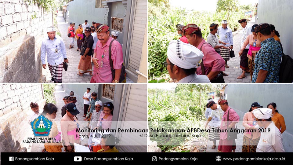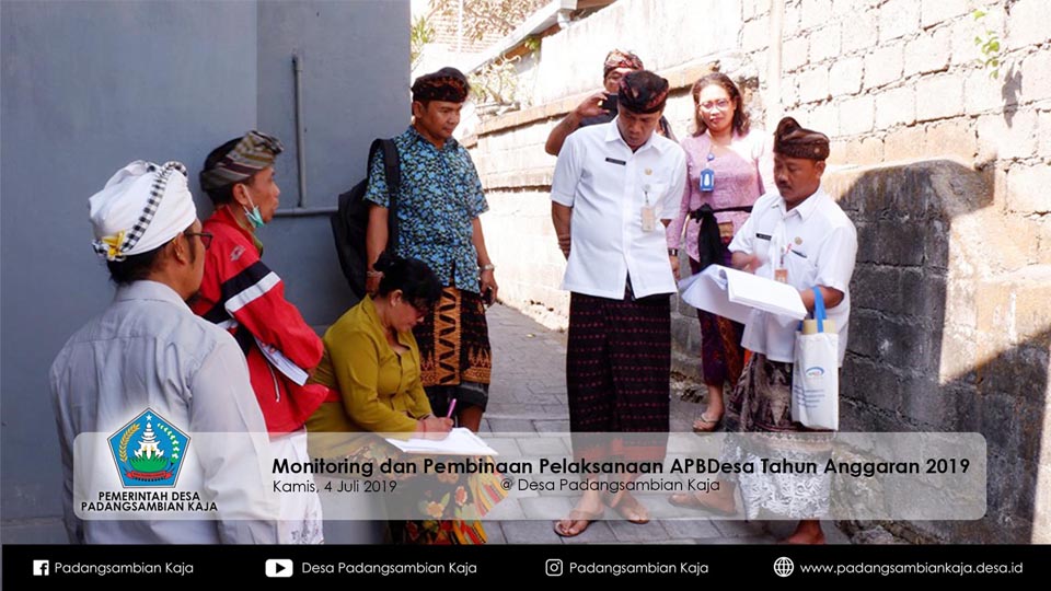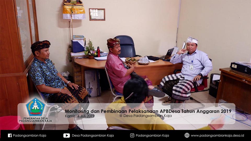 Kamis, 04/07/2019 berlangsung kegiatan Monitoring dan Pembinaan Pelaksanaan APBDesa Tahun Anggaran 2019 dari DPMD Kota Denpasar. Turut serta juga dalam tim dari Kecamatan Denpasar Barat, Pendamping Desa dan Dinas PUPR Kota Denpasar.