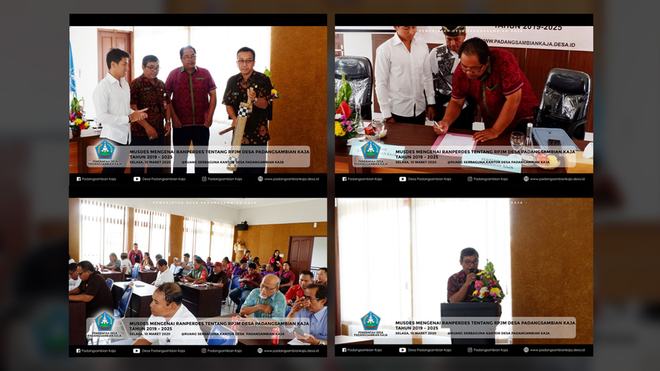 Musyawarah Desa Penetapan Rancangan Peraturan Desa tentang RPJM Desa Tahun 2019-2025 dilaksanakan pada hari Selasa, 10 Maret 2020 di Ruang Serbaguna Kantor Desa Padangsambian Kaja. Agenda tunggal dalam Musyawarah Desa ini adalah untuk membahas dan menyepakati Rancangan Peraturan Desa tentang RPJM Desa Tahun 2019-2025 yang telah disusun pasca pelaksanaan Musyawarah Perencanaan Pembangunan Jangka Menengah Desa pada bulan Februari lalu. Hadir dalam musyawarah desa ini adalah Kepala Dinas PMD Kota Denpasar yang diwakili oleh Kasi pada Bidang 2 (Bpk. Dewa Ketut Raka), Camat Denpasar Barat yang diwakili oleh Kasi Pemerintahan Kecamatan Denpasar Barat Bpk. Partha Wiguna, Anggota BPD Padangsambian Kaja, Perbekel Padangsambian Kaja, Perangkat Desa, Bhabinkamtibmas, Babinsa, Staf Desa, Pendamping Desa Kecamatan Denpasar Barat, serta tokoh masyarakat Desa Padangsambian Kaja.
