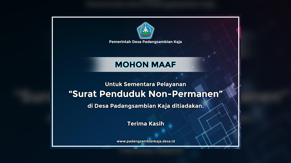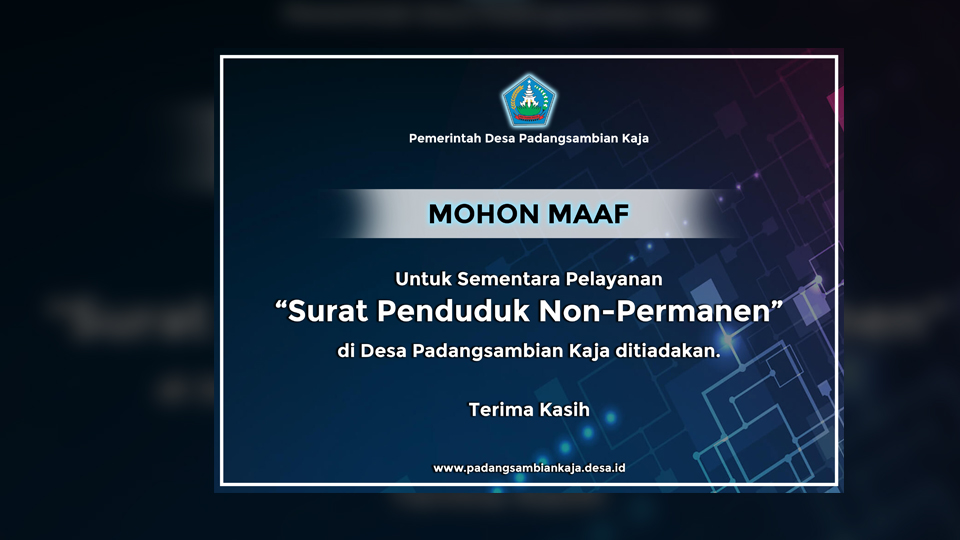 Untuk mendukung pelaksanaan Instruksi Walikota Denpasar Nomor 443/003/SATGAS COVID-19/2020 tentang Penguatan Pencegahan dan Penanganan Covid-19 di Kota Denpasar yang salah satunya dengan memperkuat pembatasan masyarakat melakukan perjalanan keluar dan/atau masuk ke Denpasar dengan ini Pemerintah Desa Padangsambian Kaja untuk sementara MENIADAKAN layanan administrasi Penduduk Non Permanen.
